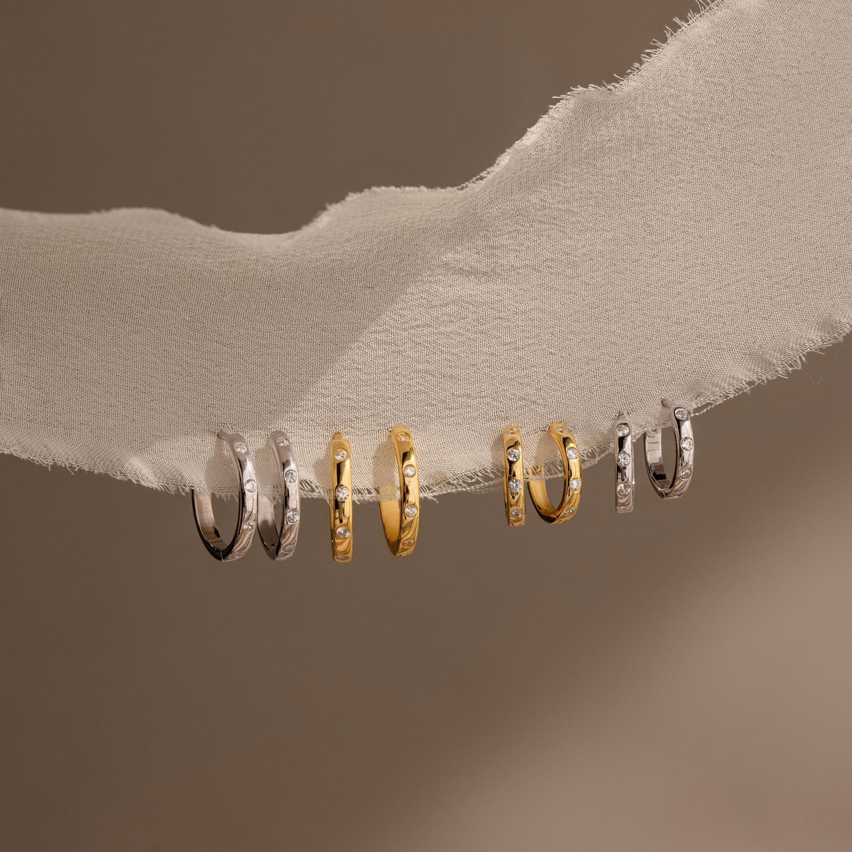Add a touch of sparkle with our Mini Diamond Sprinkle Huggies. Designed with sprinkle diamonds surrounding the classic hoop, these earrings offer a delicate way to incorporate gemstones into your jewelry. Treat yourself or someone you love to these huggie hoops and give them a little extra shine!